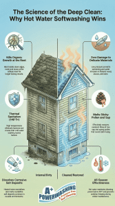 What homeowners need to know is simpler than chemistry. A+ uses hot water, a roof-specific process, and a method that cleans the roof without relying on high pressure. That is a major difference between roof cleaning done carefully and roof cleaning done like a hard-surface wash.