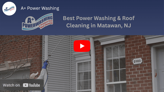 Hot water soft wash with A+ Smart Wash™ removes algae and mildew from vinyl, wood clapboard, brick, and stucco. Matawan’s diverse housing stock — from the historic Victorians on Main Street to the mid-century homes in Brownville and Lakeridge — each gets a treatment calibrated to its specific exterior material.