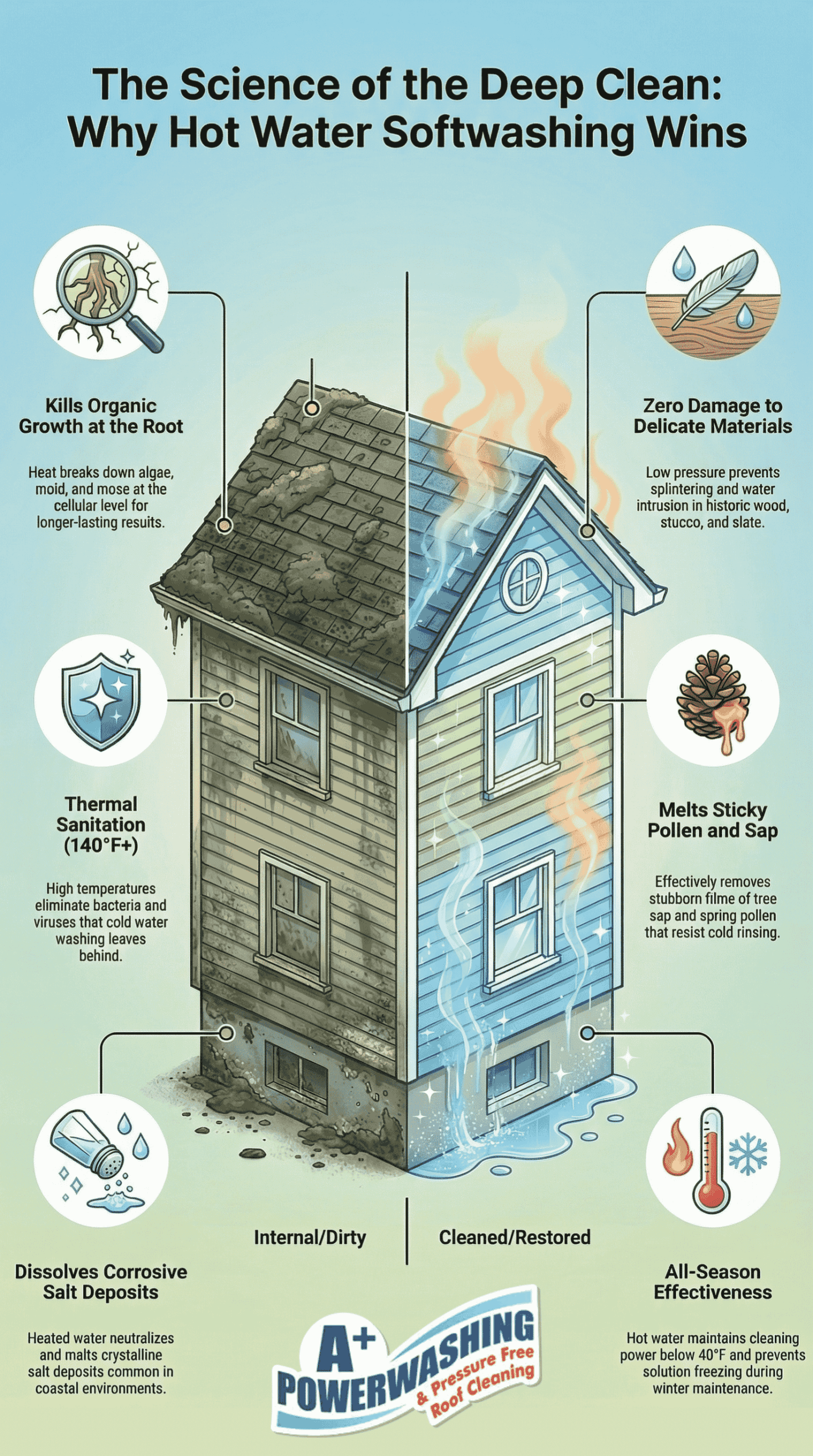 A+ Power Washing and Roof Cleaning uses hot water as a core part of its process. Most competitors in the area use cold water. The company considers its hot water approach a key part of what makes the A+ Smart Wash™ system effective on biological growth and staining.
